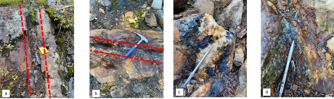 Figure 2. 2025 Field Reconnaissance Photos: (a) and (b) 10-20 cm wide quartz-sulphide veins steeply dipping and trending northeast-southwest. Close-ups of quartz veins show (c) mainly sphalerite with pyrite and chalcopyrite and (d) pyrite, chalcopyrite and sphalerite.