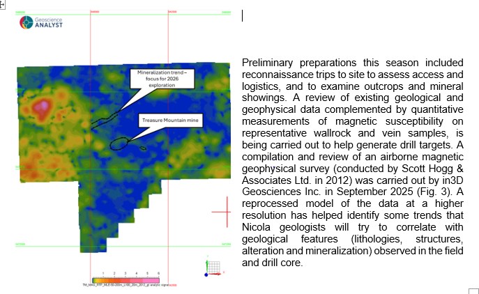Peter Espig, Chief Executive Officer, commented, "Recently we have garnered accelerated interest from both investors and strategics that have become increasingly excited about Treasure Mountain. At Nicola, we have always been aware of its significant potential, as highlighted by Coeur's investment in the Company at a time prior to Nicola securing ownership of New Craigmont Copper Project and commencing gold production and pre-investment in Dominion Gold Project. In addition to these other projects, for the past decade we have continued to review, maintain and explore Treasure Mountain, which is more than an exploration project but is a fully permitted mine that can be reopened. We continue to review all possibilities and are excited for the 2026 TM Program."
