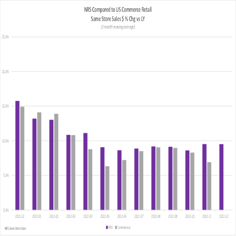 Same-store sales at NRS retailers in December 2022 increased 9.8% compared to December 2021 and 6.6% compared to November 2022