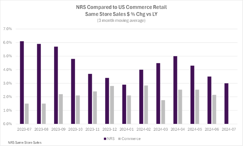Over the past twelve months, the NRS network’s three-month moving average same-store sales have outpaced the US Commerce Department’s Advance Monthly Retail Trade data, excluding food services, by