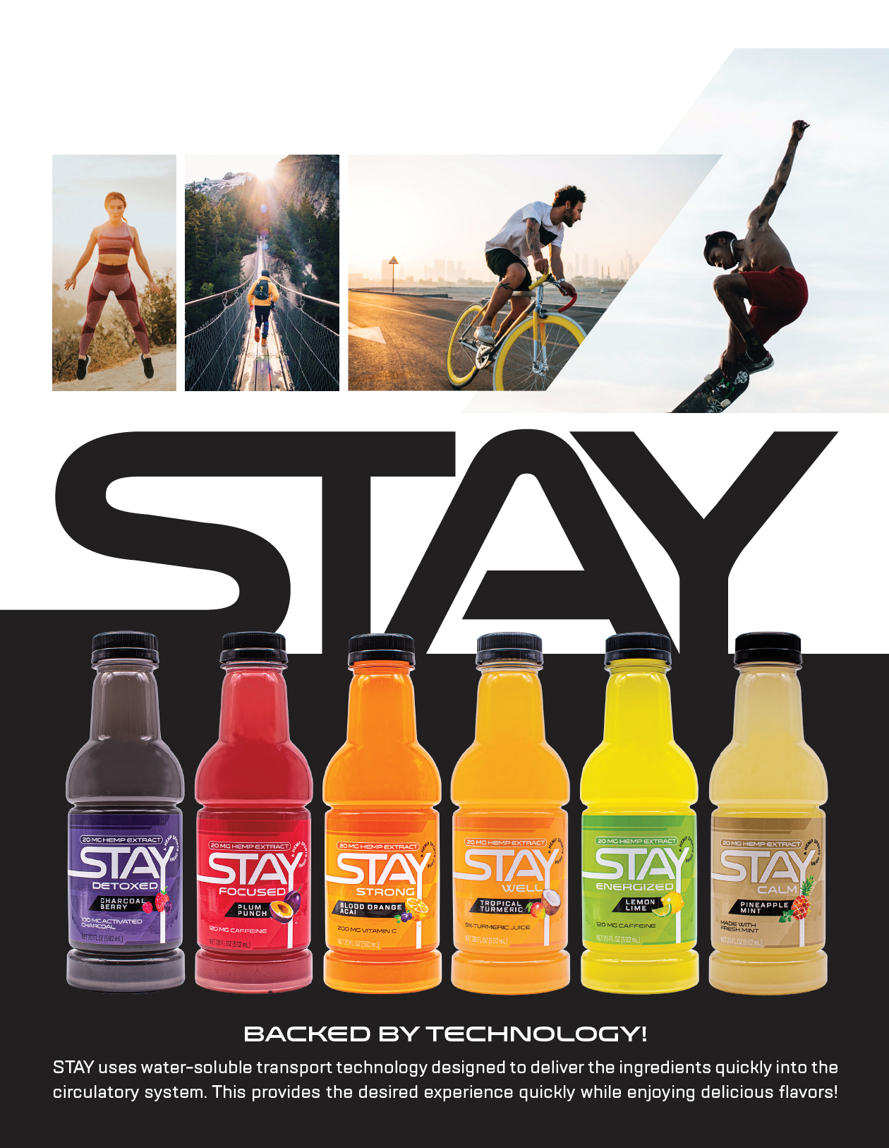 Welcome to the newest way to Replenish & Reset your body. After years in development STAY is proud to bring you, an all-natural Hemp Infused Sports Drink. After creating the perfect Sports Drink, we took the development one step further and added our proprietary cannabinoid blend of hemp. Everyone has cannabinoid receptors in their body which make up our endocannabinoid system. This system is designed to preserve and restore biochemical balance to your body. STAY replenishes your body in more ways than one! Our Fast Acting, water-soluble technology provides optimal delivery of the ingredients into your system. Give your body what it needs when it needs it – with Zero THC! Each flavor profile delivers a unique experience: Charcoal Berry – Detoxify Plum Punch – Mental Clarity Blood Orange Acai – Strength Tropical Turmeric – Wellness Lemon Lime – Energy Pineapple Mint – Calmness.