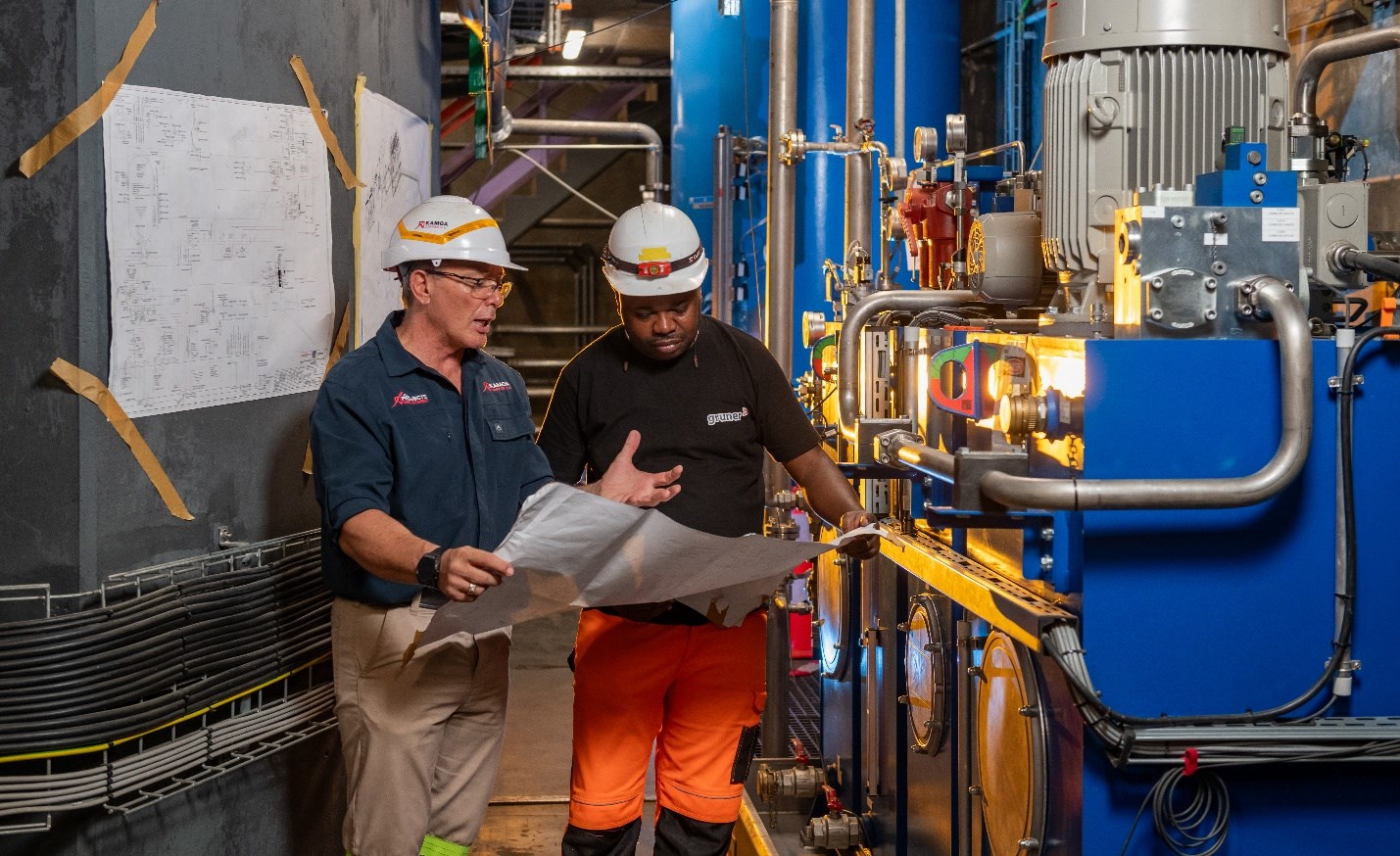 (L-R) Kasper Badenhorst, Kamoa Copper, Construction Manager, and Papy Enona, Mechanical Engineer, Gruner Stucky AG, reviewing commissioning plans during the commissioning of Turbine #5