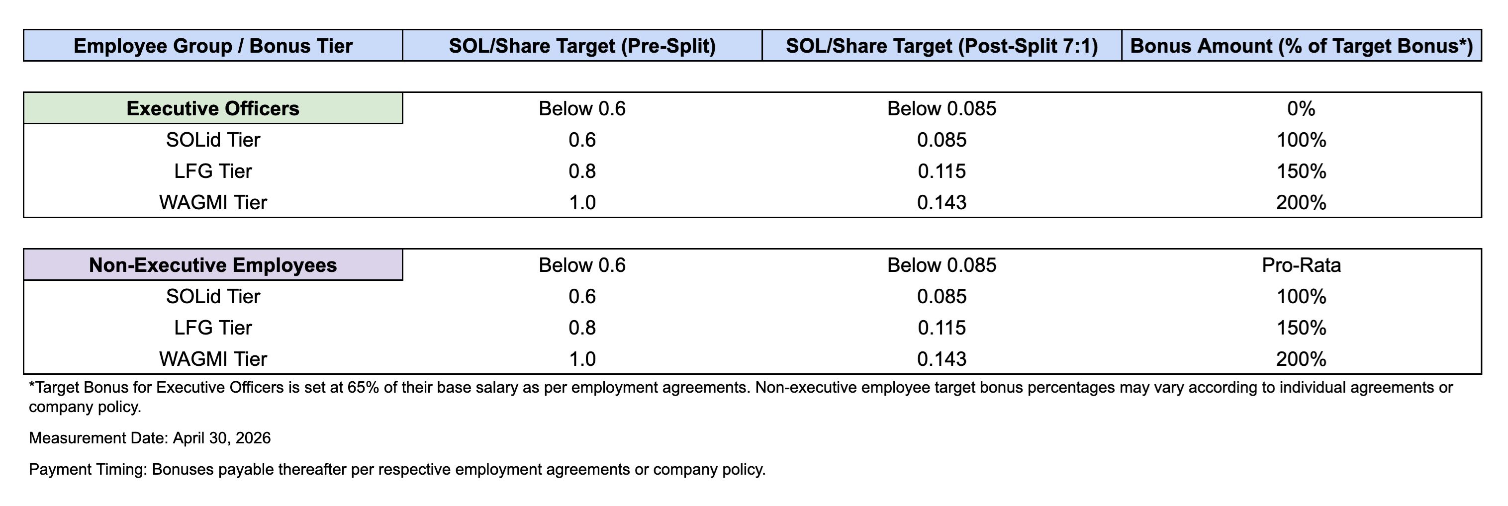 Bonus payouts for executives and treasury team scale with SOL Per Share performance. No bonuses are paid if the SOLid tier is not met