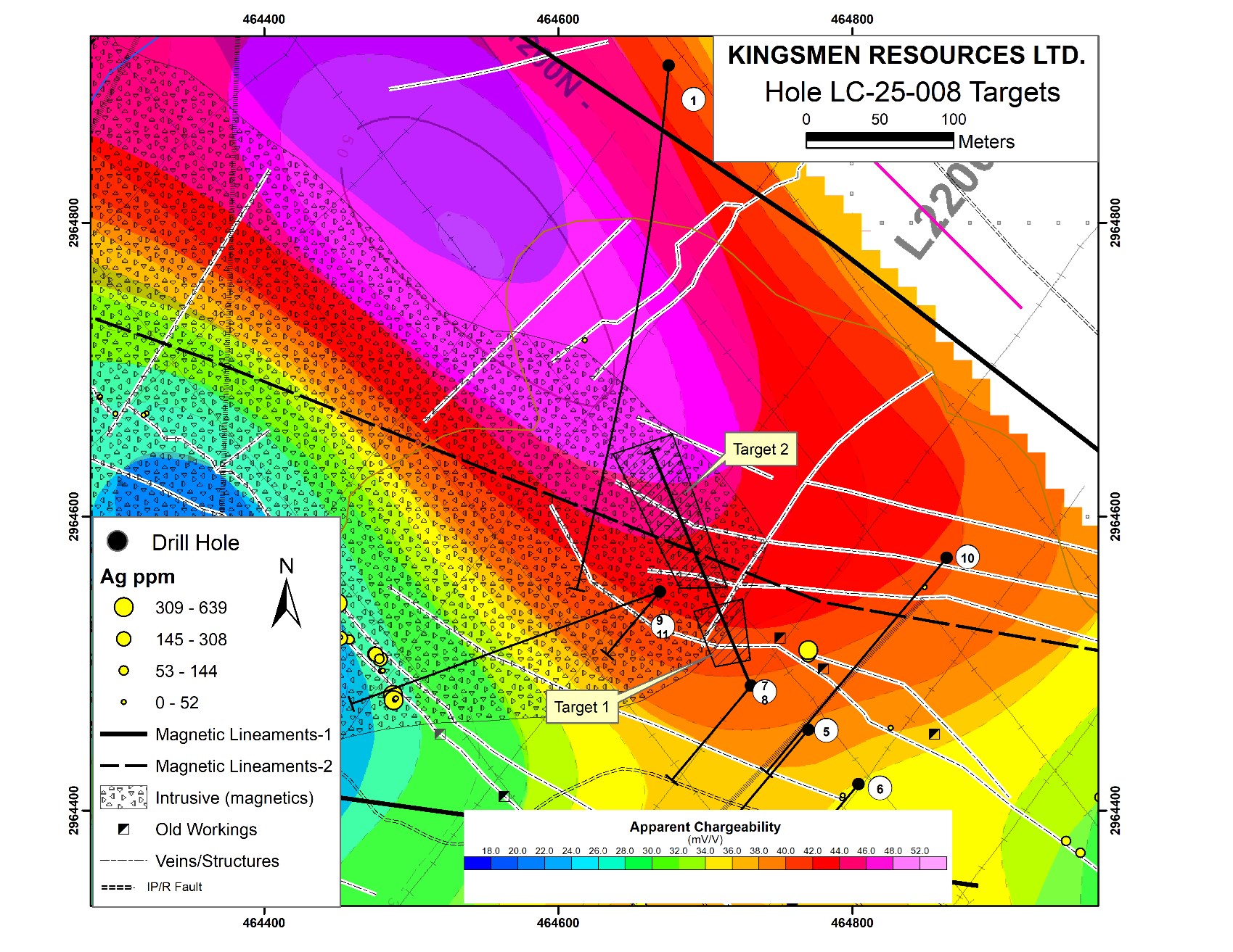 Vancouver, British Columbia--(Newsfile Corp. - December 3, 2025) - Kingsmen Resources Ltd. (TSXV: KNG) (OTCQB: KNGRF) (FSE: TUY) ("Kingsmen" or the "Company") is pleased to report first assays from hole LC-25-008 that intersected significant new gold rich silver mineralization. This hole was drilled 160 meters from the previously reported high grade silver discovery of 1,028 g/t silver equivalent over 1.45 meters (455 g/t silver) from 190.25-191.70m including 1,742 g/t silver equivalent over 0.70 meters (770 g/t silver) from 190.85- 191.55m in hole LC-25-010 (see news release September of 24, 2025). These holes were drilled as part of the recently completed 12 hole – 3,227.2 meter drill program on its