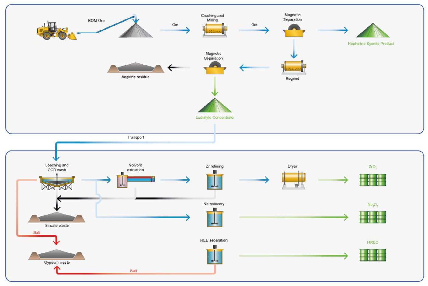 The PEA demonstrates the potential to produce a eudialyte concentrate at site through crushing, milling and a two-stage magnetic separation. This concentrate is shipped to an off-site chemical processing facility elsewhere in Sweden, close to a well-established chemical industry allowing reagents to be readily supplied, reducing the carbon footprint of the reagents and any transport risks and costs associated. Availability of cost competitive and low carbon footprint hydropower electricity in the region for the off-site facility offers a reduction in operating costs and climate impact for the energy intensive process. The proposed conceptual flowsheet is provided in Figure 3.