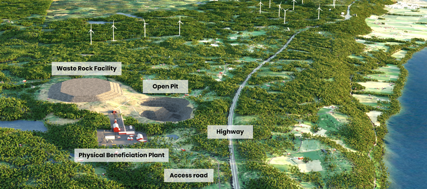 Currently the site is undeveloped within the perimeter and the area still maintains natural vegetation, forestry plantations, cultivated farmlands and farmhouses. The PEA outlines the buildings and installations required to support mining, physical comminution, waste storage, materials handling and product logistics.