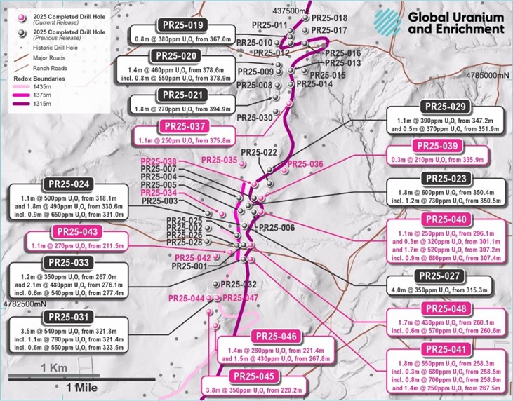 The drilling program has confirmed 24 continuous mineralized roll fronts across two major sandstone units, positioned at depths of 700-1,000 feet and 1,100-1,300 feet. These units are geologically and hydrologically isolated, making them suitable for future In-Situ Recovery (ISR) development. The project is strategically located near Cameco's Smith Ranch Mill, which has a licensed capacity of 5.5Mlbs U3O8 annually.