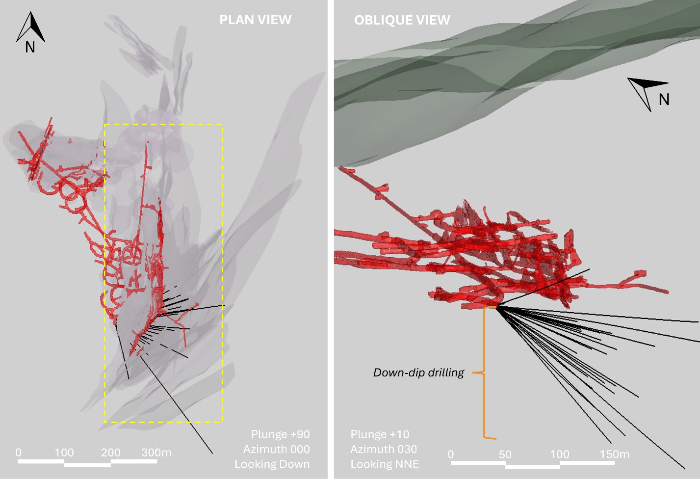 Figure 1. Location of the Zone 5 drilling reported in this news release. Left image: Plan view of the Zone 5 drilling in relation to the mineralized lodes shown in grey, with Tuvatu underground development shown in red. The yellow dashed square represents the area illustrated in the image on the right. Right image: Oblique view of the Zone 5 drilling looking NNE. The primary target for the Zone 5 drilling was the down-dip extension of the Zone 5 lodes up to 100 m below current underground workings.