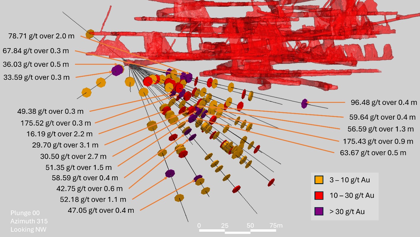 Figure 2. Zone 5 drilling with high-grade intercepts highlighted, 3.0 g/t gold cutoff, section view. Section view looking northwest with select high-grade intercepts highlighted. The drill holes shown here primarily targeted the down dip extension of the Zone 5 lodes below current underground workings shown in red. This area is targeted for mining within the next 6 to 12 months.