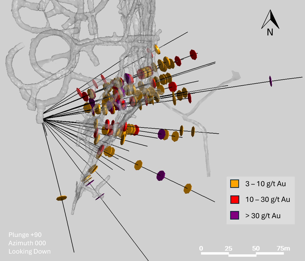 Figure 3. Zone 5 drilling with high-grade intercepts highlighted, 3.0 g/t gold cutoff, plan view. Plan view looking down with high-grade intercepts highlighted, underground workings shown in pale grey.