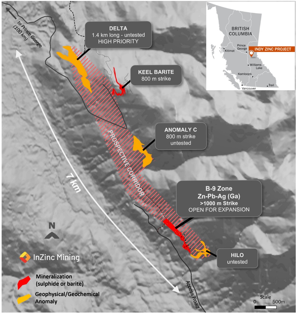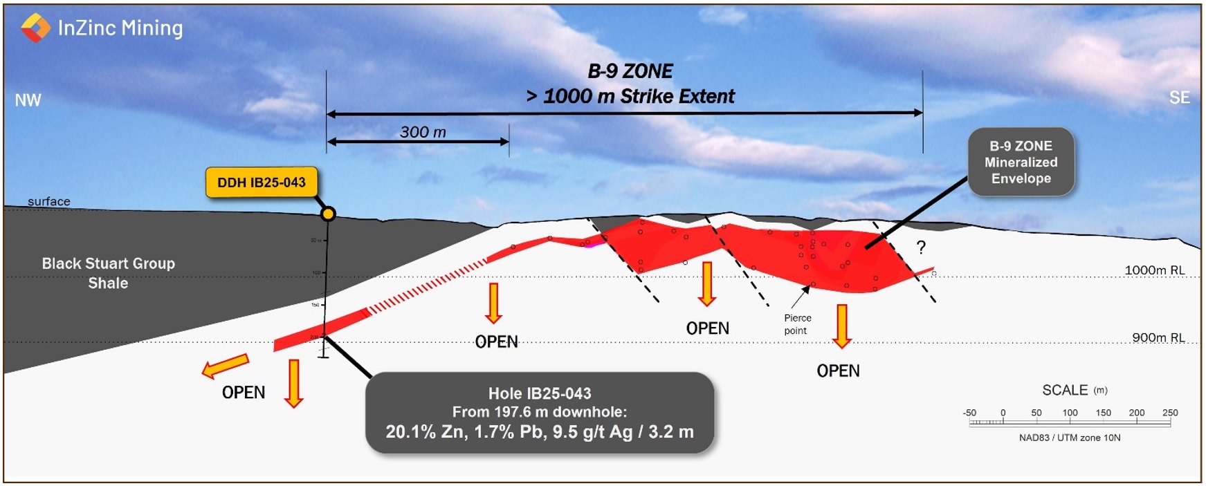 "We are delighted with the success of the 300 m step-out discovery in drill hole IB25-043. These are exceptional grades, comparable to top quartile zinc-lead-silver deposits globally. The strike extent of B-9 Zone mineralized system is now on scale with that associated with the large Sedex deposits in northwestern Canada. The Indy project is emerging as a tremendous new discovery opportunity in a premium location," remarked Wayne Hubert, CEO of InZinc.