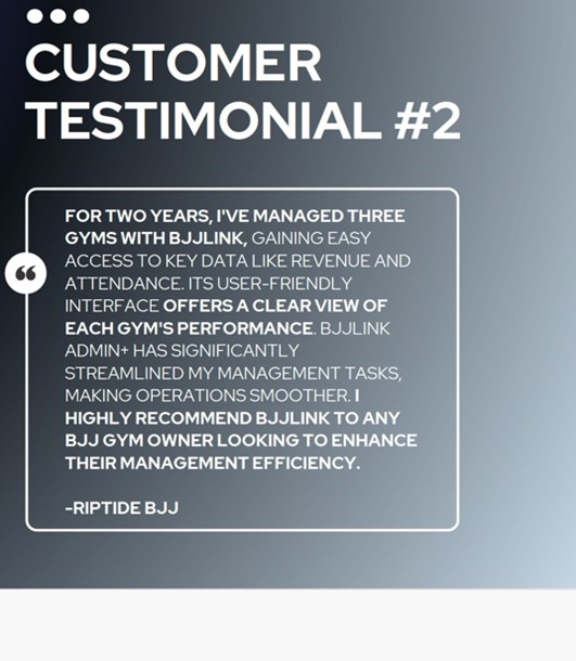 BJJLink offers the most complete gym management solution specifically catering to jiu jitsu academy needs around the world including a comprehensive suite of tools for payment processing, marketing, student engagement, website building and content monetization. Its innovative platform allows jiu jitsu practitioners to create income streams by sharing their expertise while providing academies with robust solutions to streamline operations, attract members, and drive revenue growth.