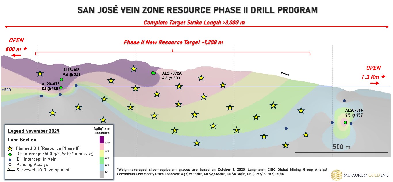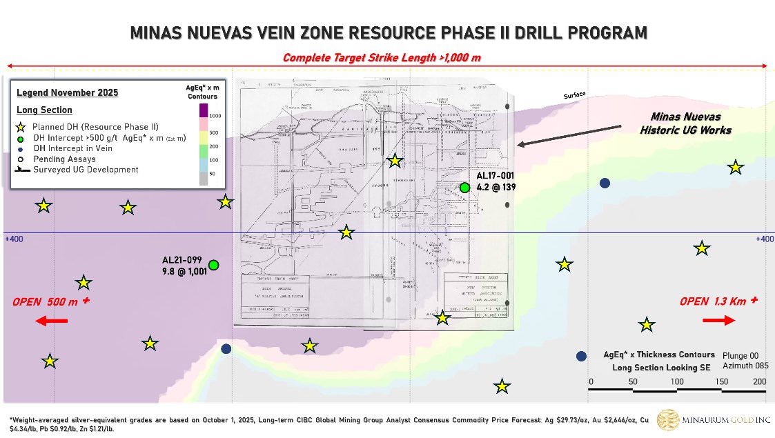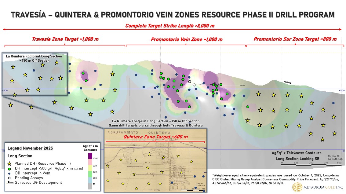 Phase I Drilling targeted three high-grade vein zones — Promontorio, Europa, and Travesia — which will form the basis of the inaugural resource. Initial results have been released and continue to demonstrate continuity of high-grade silver mineralization (see Minaurum news release dated October 16, 2025). Once received, the remaining assays will be incorporated into the resource model in advance of the announcement of the resource estimate.
