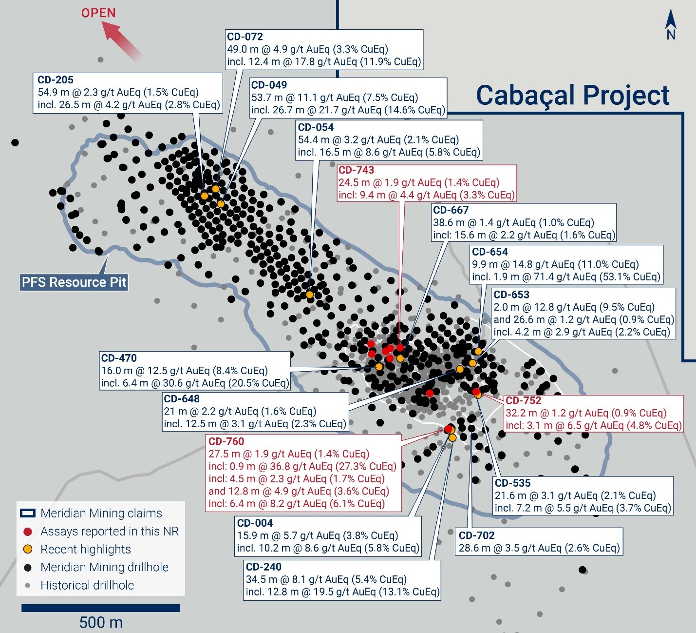 Key assay highlights include CD-760: 27.5m @ 1.9 g/t AuEq and 12.8m @ 4.9 g/t AuEq, CD-743: 24.5m @ 1.9 g/t AuEq, and CD-752: 32.2m @ 1.2 g/t AuEq. Greenfields drilling at Cigarra identified a 2.0 km VMS trend with initial results including 3.1m @ 0.5 g/t Au and 6.2 g/t Ag and peak assays of 1.5 g/t Au and 12.1 g/t Ag. Meridian reports ~CAD 60 million cash on hand and ongoing exploration drilling.