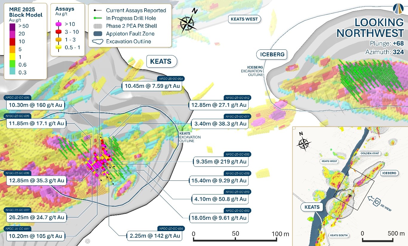 With channel sampling at the Keats and Iceberg excavations complete (see the New Found Gold news releases dated September 23, 2024, December 2, 2024 and September 25, 2025), a 5 m by 5 m definition drilling program covering a 65 m by 30 m area has recently been completed at the Keats zone and a 5 m by 5 m definition drilling program covering a 60 m by 45 m area has commenced at the Iceberg zone in late Q4/25.