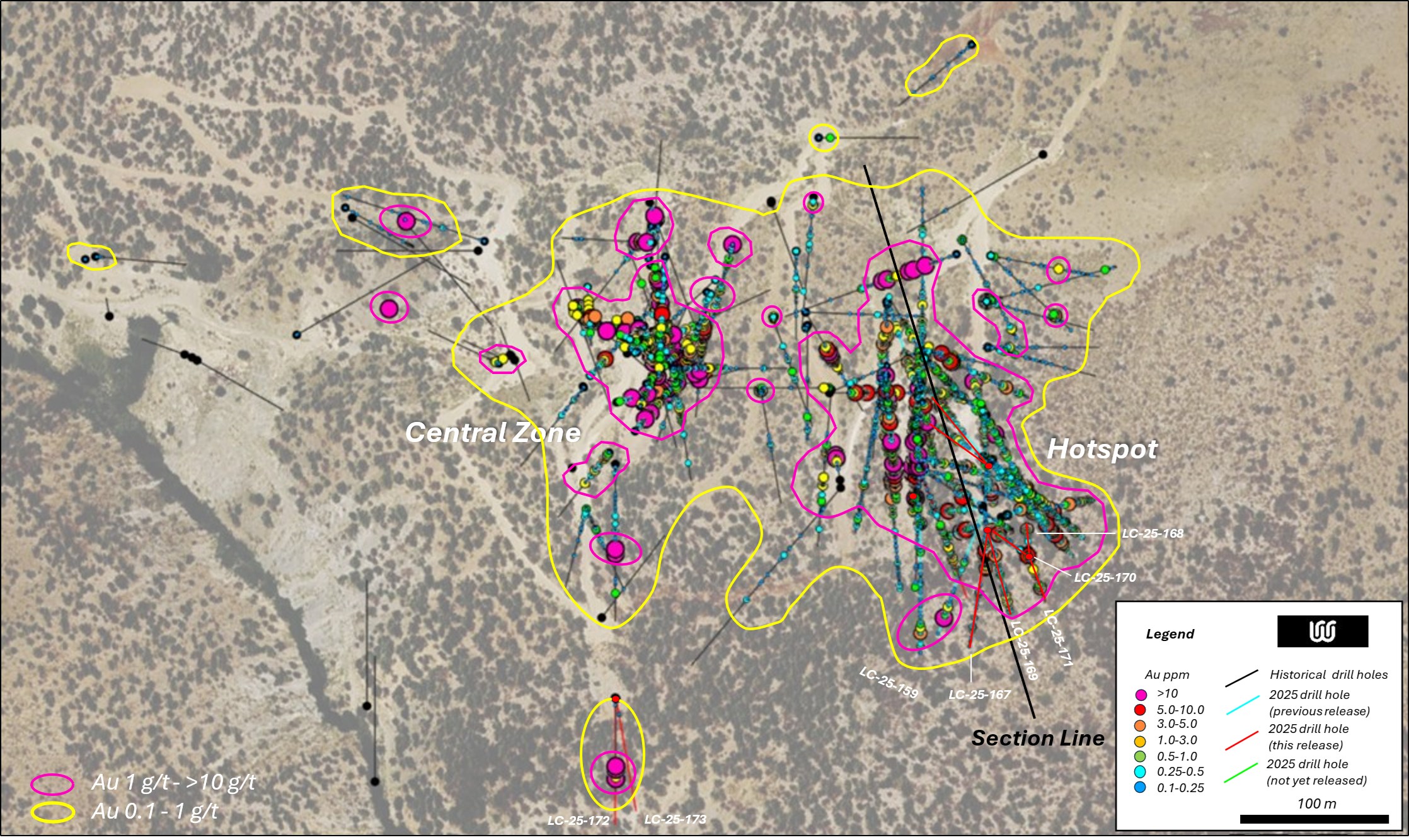 - 3.79 g/t Au over 85.34 meters starting at 143.26 meters, including 16.49 g/t Au over 6.10 meters, and 10.24 g/t Au over 6.09 meters in hole LC-25-170.