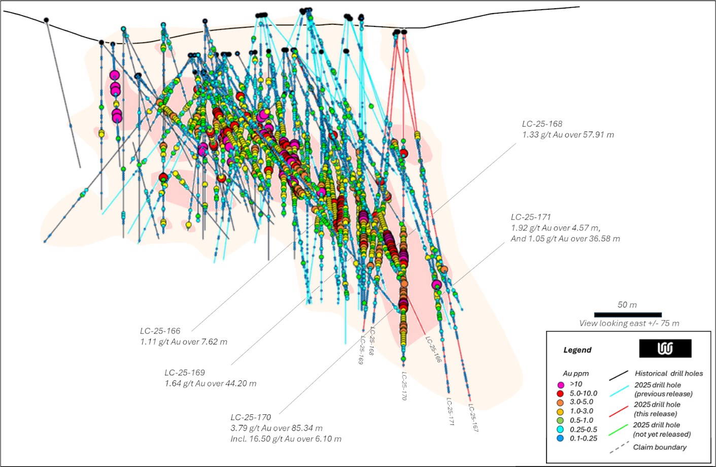 - 1.92 g/t Au over 4.57 meters starting at 74.68 meters and 1.05 g/t Au over 36.58 meters starting at 175.26 meters in hole LC-25-171.
