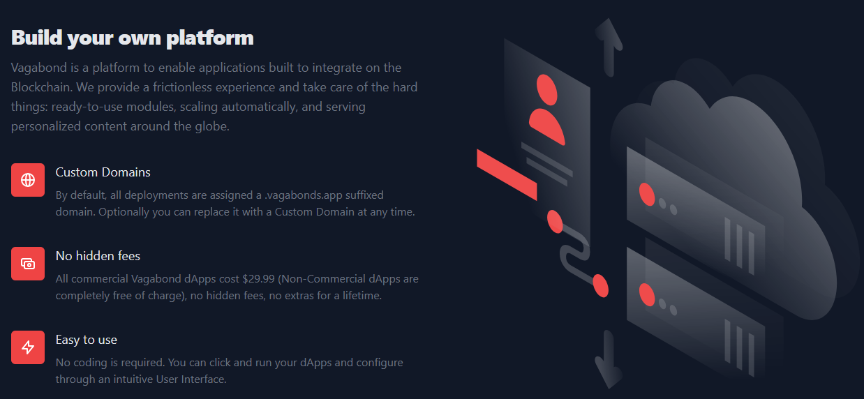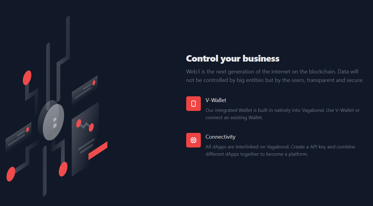 Vagabond is a Blockchain-as-a-Service Platform that enables businesses to implement the benefits of Blockchain into their operations. We see a significant market potential that addresses the most notable challenges companies face in deploying blockchain solutions - the cost and time of implementation and adoption. Vagabond sets to build its community for individuals and supports users to experiment, learn or run their dApps (e.g. NFT Marketplace) based on the Vagabond platform. Vagabond’s primary strengths are predefined processes and modules that the user can use and adapt without writing a single line of source code.