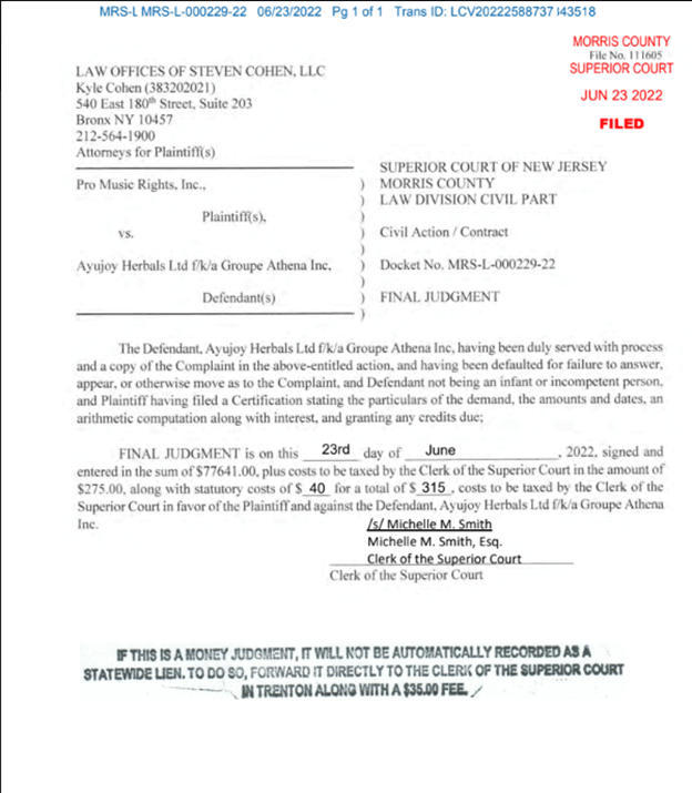 NAPLES, Fla., Aug. 30, 2022 (GLOBE NEWSWIRE) -- Pro Music Rights, Inc. (OTC: NUVG), one of the world's largest music licensing companies, today announced Pro Music Rights has prevailed in its lawsuit against Ayujoy Herbals (OTC: AJOY) (“AJOY”) f/k/a/ Groupe Athena with a secured judgment in the amount of