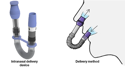 To use the device, the safety cap is removed, and the device is inserted into a single nostril at one end and in the mouth at the other (as indicated on the device). Intranasal delivery is performed by sharply exhaling through the device.