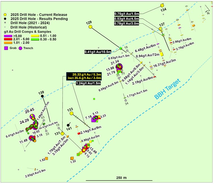 Hole 25ODD-137, another inclined hole, is located 550m ENE of hole 131. It intersected shallow mineralization, including 0.53 g/t Au over 4.5m, 0.38 g/t Au over 4.5m, and 0.78 g/t Au over 3.0m. All of these intersections are at a vertical depth of less than -52m. Nearby, an historic drill hole intersected 0.74 g/t Au over 94m near surface. Given the proximity to surface and being hosted within unconsolidated material, it is possible that with further drilling these could contribute to a future Mineral Resource Estimate.