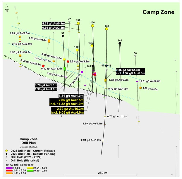 Most significant new results from the Camp Zone include 2.72 g/t Au over 16.3m in hole 25ODD-135 at a depth of -115m, 6.81 g/t Au over 1m and 2.05 g/t Au over 7.5m in hole 25ODD-136 at a depth of -180m, and 0.85 g/t Au over 12.70m in hole 25ODD-138, also above -200m depth. In all of these cases, the mineralization occurred within the felsic dikes, believed to be correlated to the preferentially mineralized "Dike Corridor" seen at the main Wenot deposit, and to previously drilled gold-bearing felsic dikes along strike in the Camp Zone.