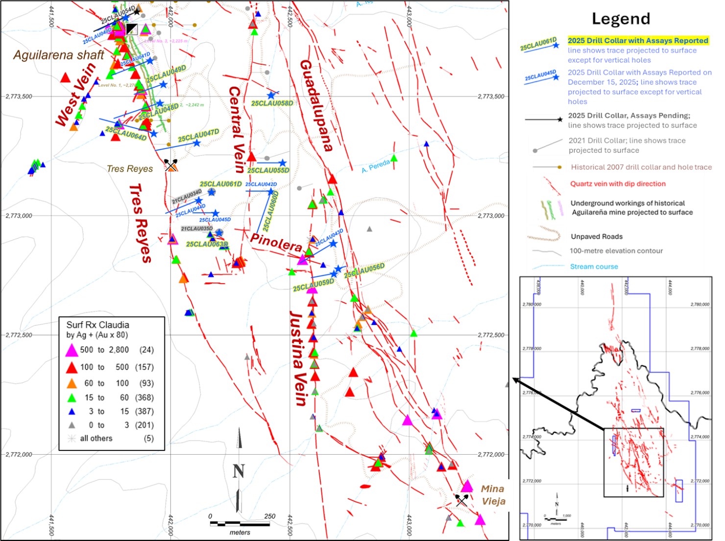 3) The Pinolera trend (Figure 1) is a N70W-striking, up-to-40-m-wide zone of subparallel veins - mostly only a few centimetres wide individually at surface - that crosses both the Central and Justina veins. Hole 25CLAU060D was drilled to investigate the subsurface location of these subparallel veins and intersected a broad zone of low-grade stockwork and spaced narrow veins in the hanging wall of the Central vein, returning 14.15 m averaging 0.58 g/t Au and 24 g/t Ag, including 2.15 m of 1.62 g/t Au and 90 g/t Ag from 114.45 m. Most importantly, this hole also intersected and extended the Central vein approximately 150 m south of previously reported hole 25CLAU042, with 3.15 m averaging 0.85 g/t Au and 43 g/t Ag from 92.4 m. Hole 25CLAU060D is not believed to have reached the core of the Pinolera trend, and therefore did not test the potentially more favourable zone where the Pinolera trend intersects or merges with the Central vein.