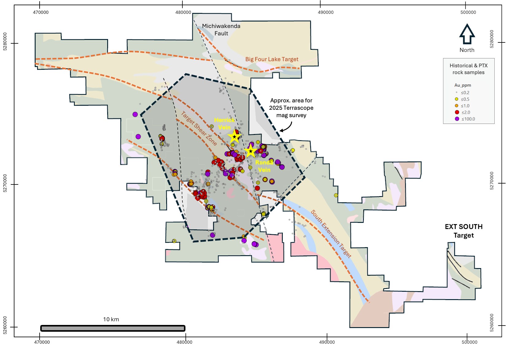 Figure: Shining Tree Project claim extension and location of the upcoming 2025 Terrascope magnetic survey. Background map is the geological map from the Ontario Government and rock samples are historical data from the Company's surface work cumulated to date. For illustration only rock samples are shown above and do not represent the full extent of sampling previously done on the property.