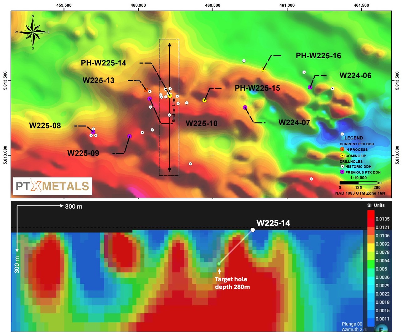 Drill planning was based on multiple lines of geological evidence, leading to targeting of a never-before-tested geological interpretation of the property which is expected to more precisely guide current and future drilling at the W2 property. Data considered during drill planning includes, but is not limited to, previous PTX and historic drilling cumulating more than a 120 drill holes, the recent 2025 high-resolution magnetic survey and the subsequent 3D inversion model, the electromagnetic survey and the resulting Maxwell Plates. Latest compilation of data and the newest drill holes from PTX show that the mineralization is mainly hosted within a deformed, sulfide-bearing, highly magnetic gabbroic unit, which has been affected by various structural regimes. These previous steps allow significant de-risking for targeting wide mineralized intersections and potential localized massive sulfides zones intercepts.