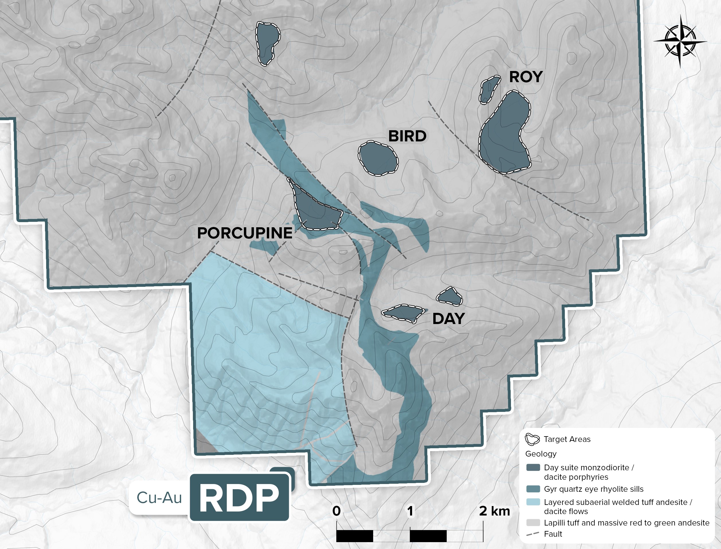 The 2025 drill program at RDP was focused on the Day target with the objective of following up on drill hole RDP-22-005, confirming that the porphyry Cu-Au-Ag mineralization intersected in RDP-22-005 is hosted in an east-northeast-striking, steeply northward-dipping tabular body, and testing the western magnetic lobe.