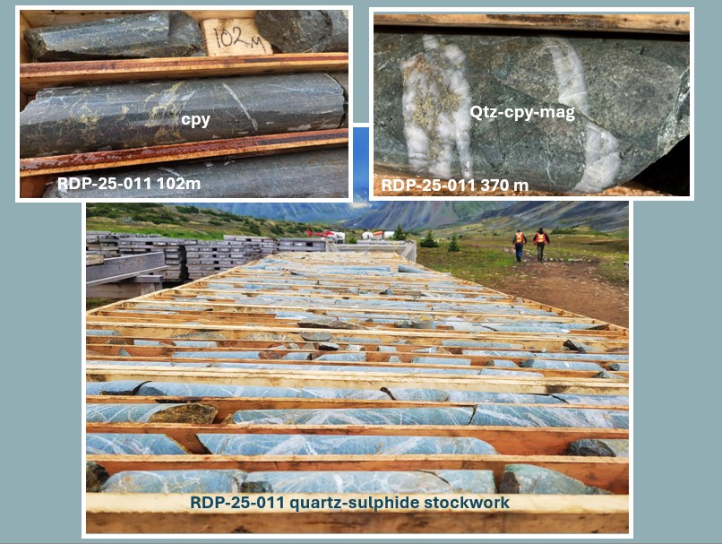 RDP-25-011 was drilled from the same location at an azimuth of 48o degrees and dip of 65o to a depth of 431 m and cut underneath and to the northwest of RDP-22-005. Patchy potassic alteration (k-feldspar-magnetite) was intersected as well as intervals of strong quartz-magnetite sulphide veining, chalcopyrite+/- bornite mineralization (see Figure 5) hosted in early-mineral monzodiorite and hydrothermal breccia, extending mineralization to the north of RDP-22-005 by a minimum of 35 m, with mineralization still being open to the north.