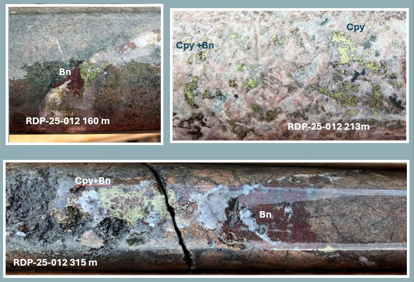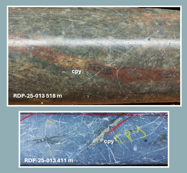 RDP-25-012 (48o /- 65o /363 m length) and RDP-25-013 (160o /- 70o /582 m length) were drilled from a site 170 m northeast of RDP-22-005 to test the interpreted tabular porphyry Cu-Au mineralization geometry between RDP-22-005 and RDP-23-007, which was collared 300m NE of RDP-22-005 and ended in 19.0 m of