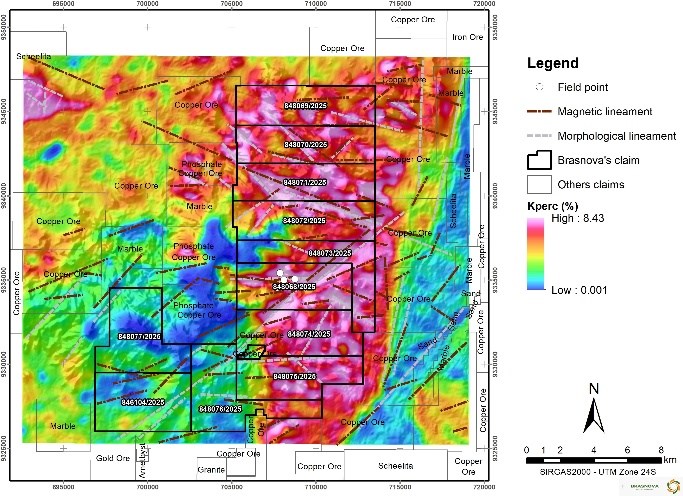 The Jucurutu Project (Table 1) is characterized by the presence of coincident morphological and magnetic lineaments, suggesting structurally controlled mineralization corridors. Preliminary geophysical interpretation indicates that copper occurrences identified during reconnaissance field visits are spatially associated with high potassium radiometric anomalies, particularly at intersections between magnetic and morphological lineaments (Figures 6 and 7).