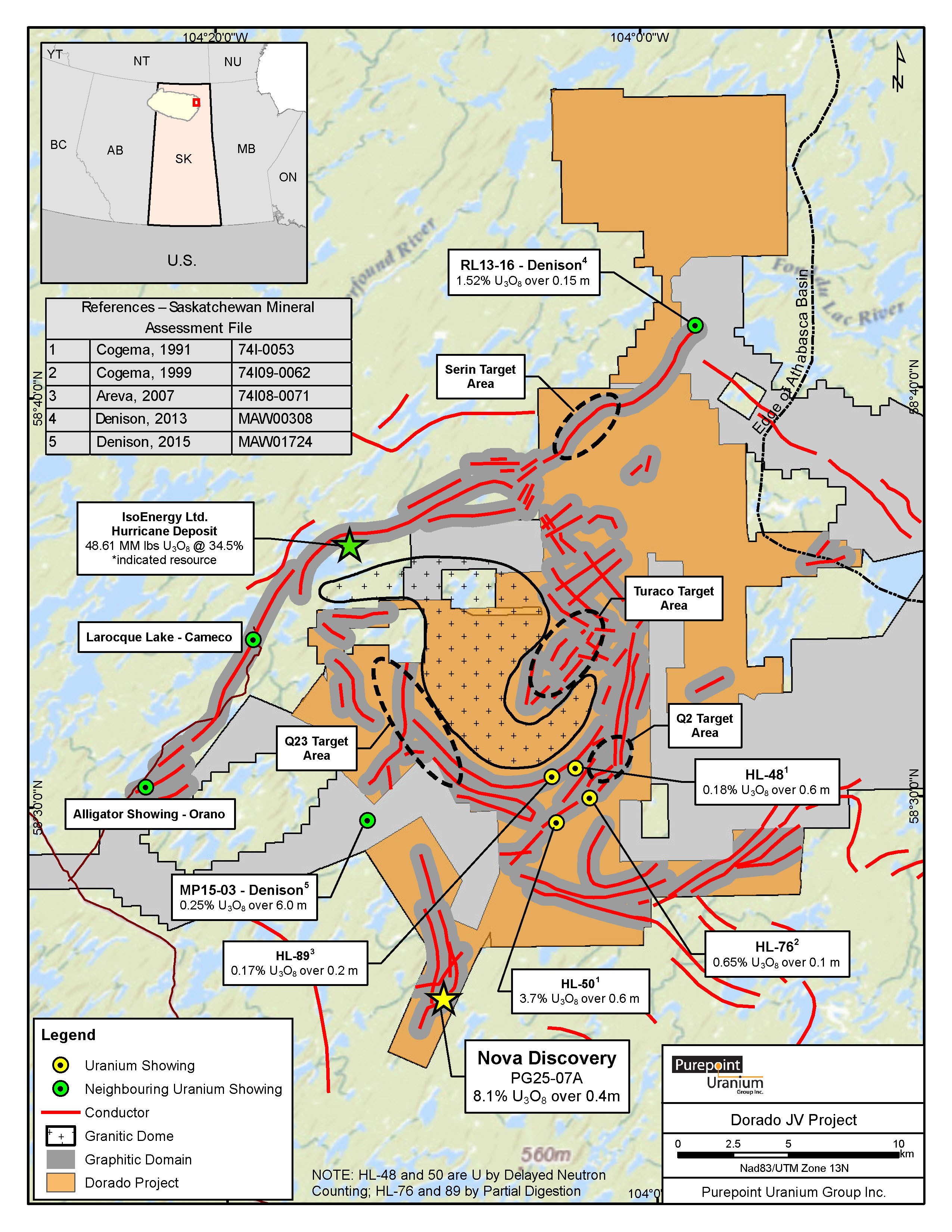 The Dorado Project (Figure 1) is the flagship project of the IsoEnergy-Purepoint 50/50 joint venture, a partnership encompassing more than 98,000 hectares of prime uranium exploration ground. The Dorado Project includes the former Turnor Lake, Geiger, Edge, and Full Moon properties, all underlain by graphite-bearing lithologies and fault structures favorable for uranium deposition.