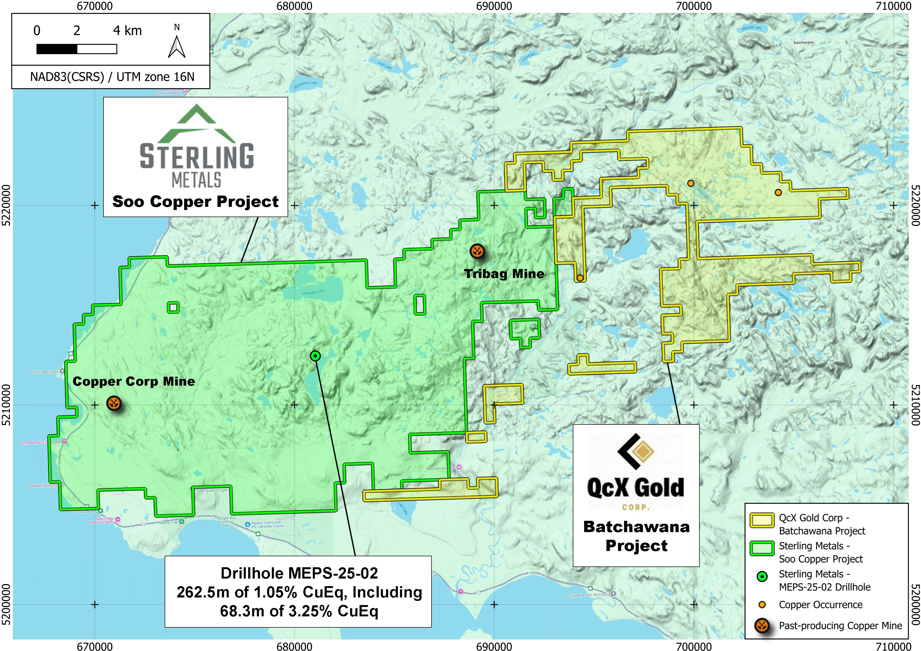 Figure 1: Displaying the QcX Gold Corp's Batchawana Project adjacent to the Sterling Metal's Soo Copper project