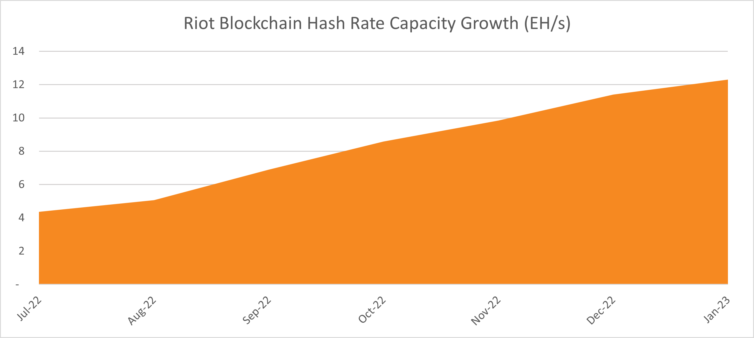 - Anticipates total hash rate capacity growth to 12.5 EH/s by January 2023.