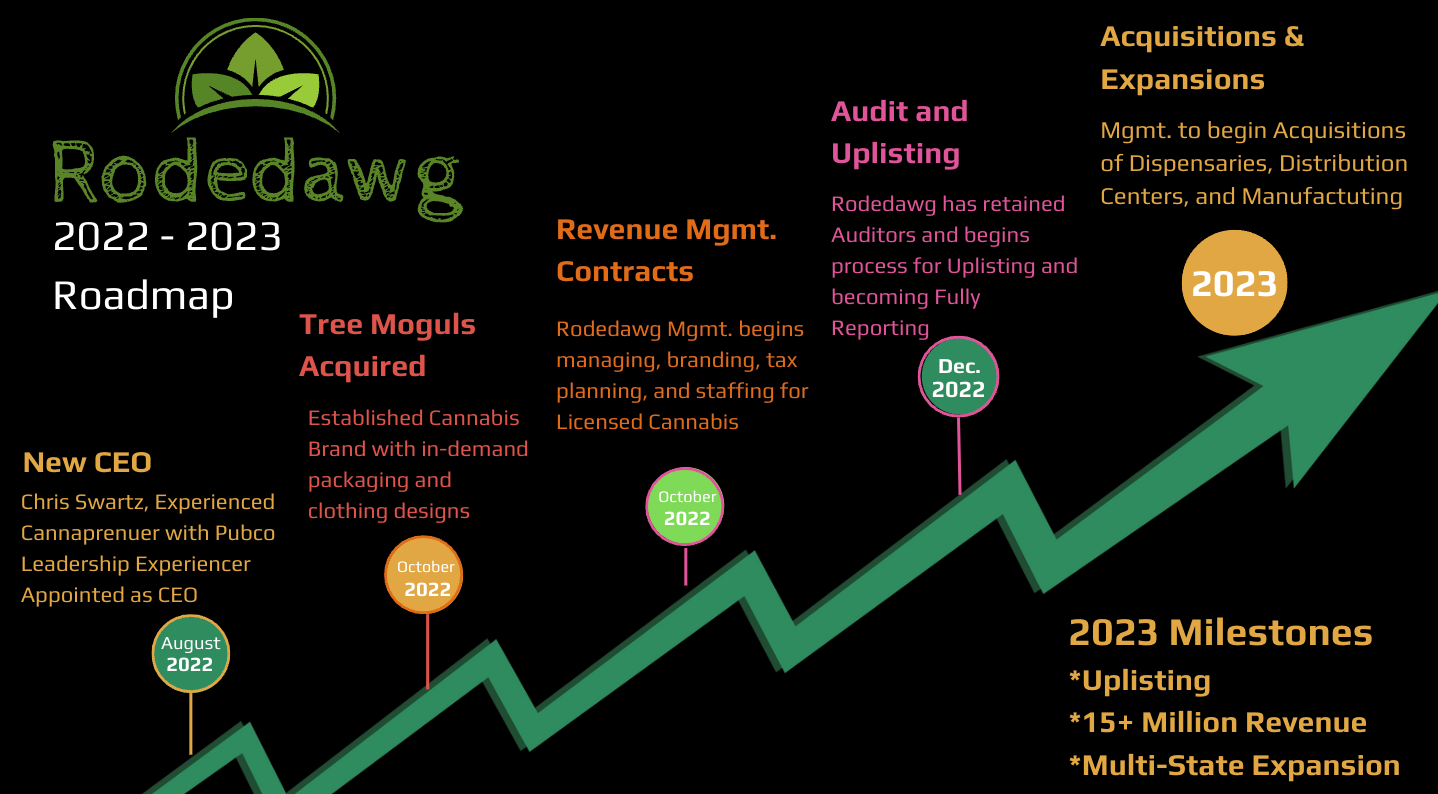 Mr. Swartz states, “During the next six months, we will remain focused to the accomplishment of our success milestones and developing expanded shareholder value. We expect that with our efforts for expansion of brands with immediate revenues, continued work on cancellation of over 85 million shares, and expansion of management contracts that expand our revenues which in turn lead to acquisitions, we can confidently and steadfastly have Rodedawg become a recognized profitable cannabis licensed operation. We want our shareholders to be able to see the progress and successes visibly with accurate and ongoing reporting back to the shareholders. Our plan from the beginning has been positioning the Company for significant growth leading to OTCQB uplisting. In the coming days and weeks, our shareholders will be seeing the growth.Finally, our team wants to reiterate, that no reverse split is planned as we grow the Company.”