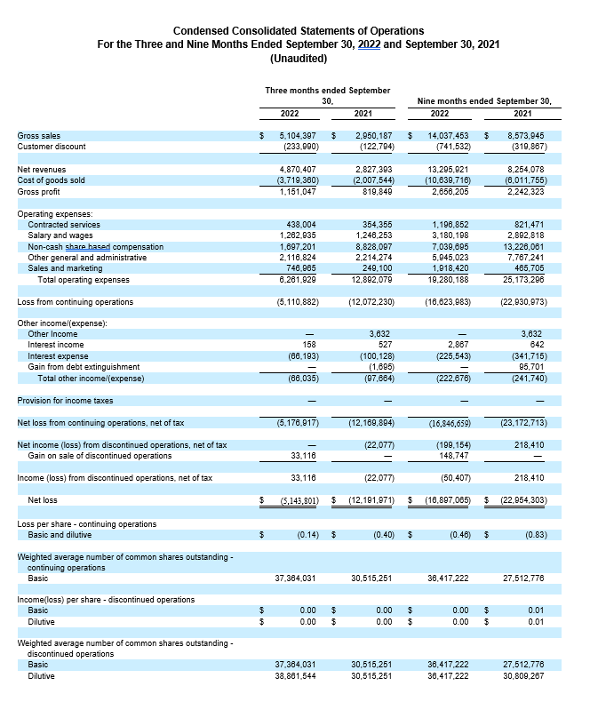 $5.1 million compared to a loss of$12.1 million in the prior year period. For the nine-month period, the net loss narrowed to$16.6 million from$22.9 million in the prior year period. The decrease in net loss is due primarily to an increase in revenues as well as lower operating expenses and non-cash items. - As of September 30, 2022, the company had total cash and cash equivalents of