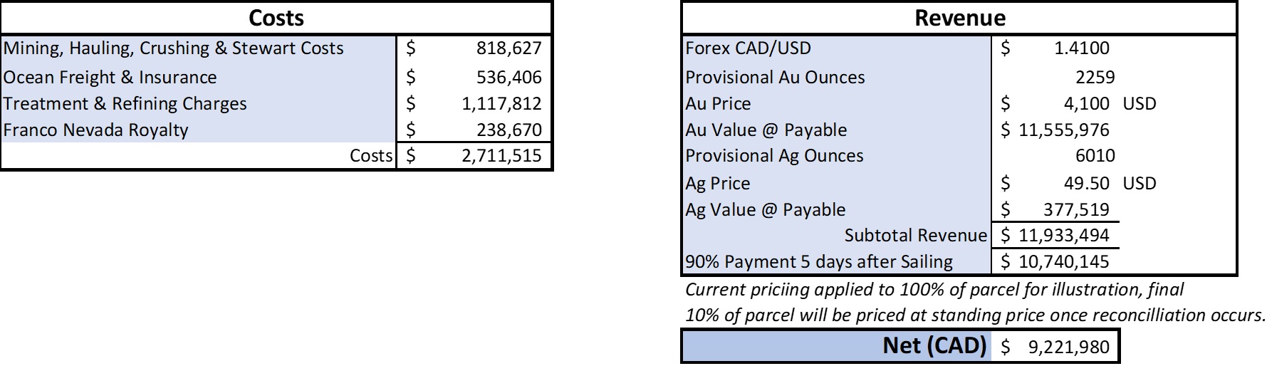 Scottie has elected to "Advance Price" this parcel, which is a feature of both our long term and Bulk Sample agreements with Ocean Partners. This enables Scottie to take a futures price for any parcel, rather than reconciling on M+1 or M+3 pricing terms, which would be the normal course under the agreement. The prices are included in the Revenue table above and come from the LME futures market via Ocean Partners' hedging desk.