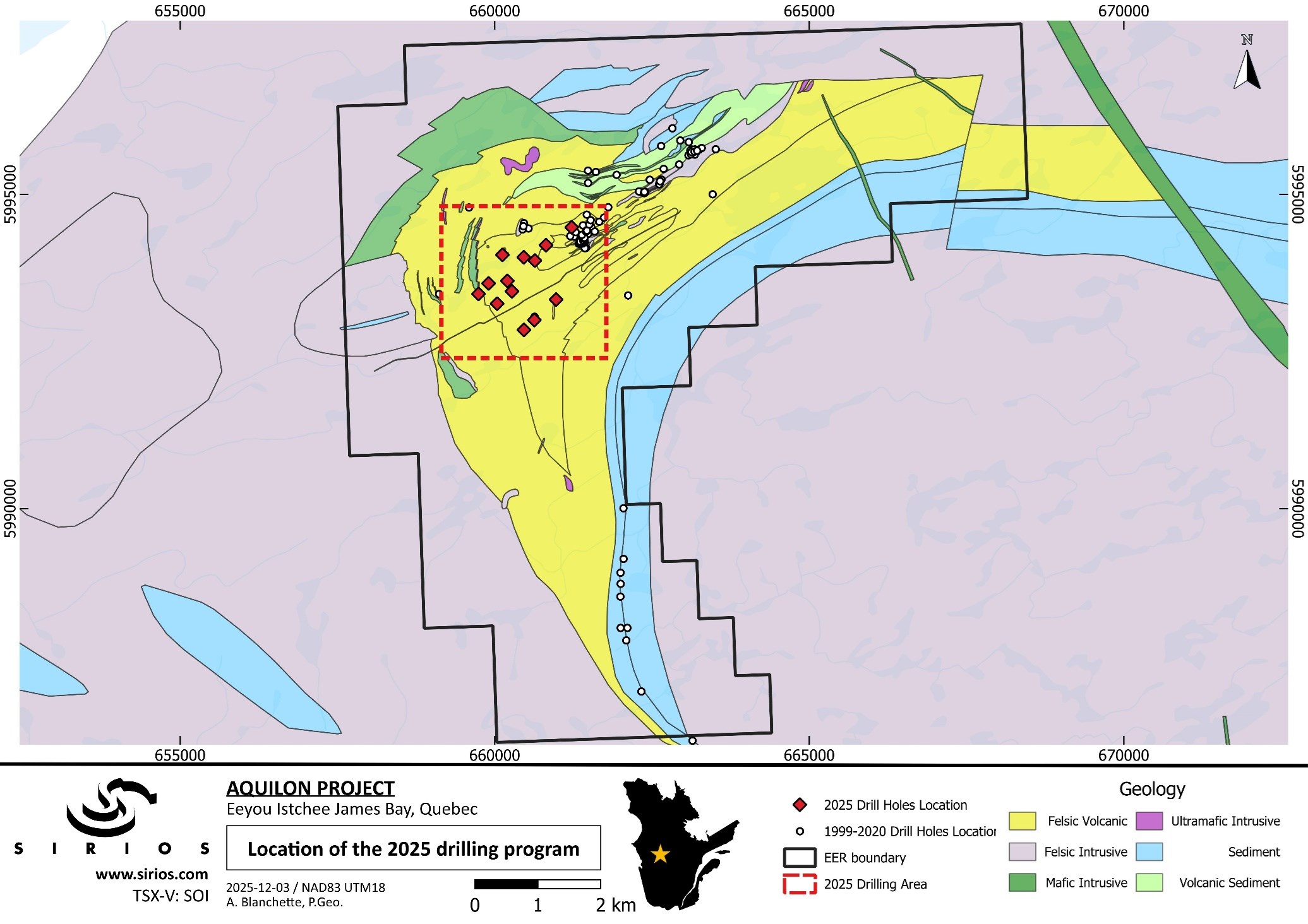 Montreal, Quebec--(Newsfile Corp. - December 4, 2025) - Sirios Resources Inc. (TSXV: SOI) is pleased to report assay results from the 2025 summer diamond drilling campaign on its Aquilon gold project, located in Eeyou Istchee James Bay, Quebec.