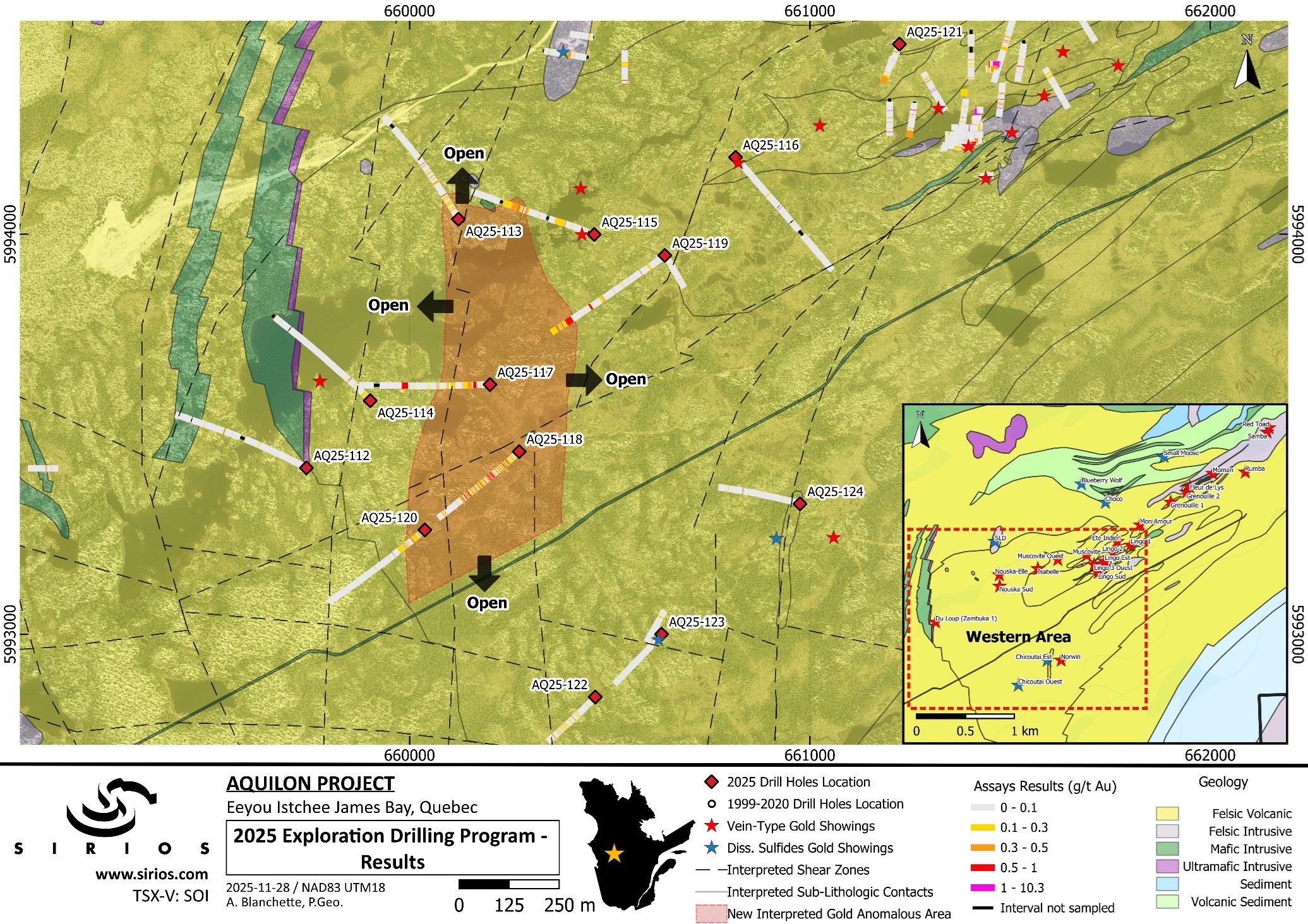 Sirios (TSXV:SIREF) reported 2025 drill results from the Aquilon gold project in Eeyou Istchee James Bay, Quebec, from 13 holes totaling 5,420 metres. The program discovered a strongly anomalous gold halo in felsic volcanics extending over >1 kilometre and several hundred metres wide, open in all directions.