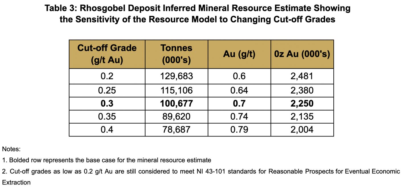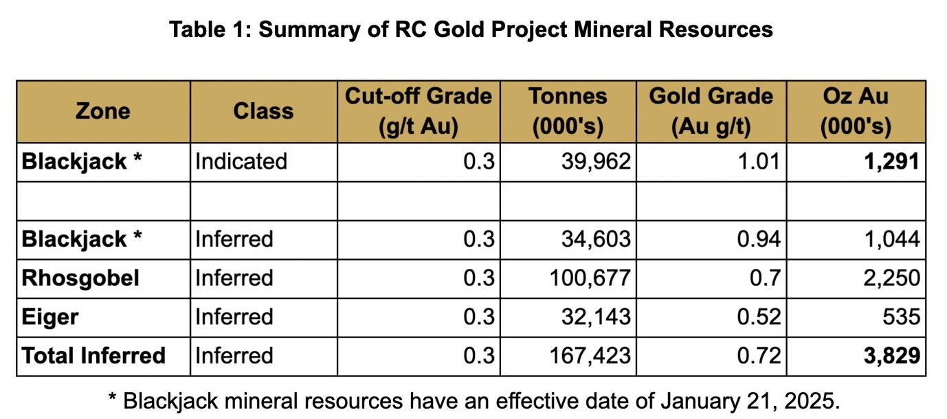 The updated MRE for RC Gold includes an initial resource estimate for the newly discovered Rhosgobel Gold Deposit of 2,250,000 ounces of gold inferred (100.68 Mt @ 0.70 g/t Au), beginning at surface and grading 0.70 g/t gold using a cut-off grade of 0.30 g/t gold, an updated resource estimate for the Eiger Gold Deposit of 535,000 ounces of gold inferred (32.14 Mt @ 0.52 g/t Au), beginning at surface and grading an average of 0.52 g/t gold using a cut-off grade of 0.30 g/t gold and the existing mineral resource estimate for the Blackjack Gold Deposit, which was updated last year with an effective date of January 21, 2025, comprising an indicated resource of 1,291,000 ounces of gold in 39.96 Mt grading 1.01 g/t gold and an inferred resource of 1,044,000 ounces of gold in 34.60 Mt grading 0.94 g/t gold beginning at surface and using a cut-off grade of 0.30 g/t gold. The MRE for the RC Gold Project now comprises 1,291,000 ounces gold indicated (39.96 Mt @ 1.01 g/t Au) at Blackjack, and 3,829,000 ounces gold inferred, including: 2.25 million ounces (100.68 Mt @ 0.70 g/t Au) at Rhosgobel, 1.04 million ounces (34.60 Mt @ 0.94 g/t Au) at Blackjack, and 0.54 million ounces (32.14 Mt @ 0.52 g/t Au) at Eiger (see Tables 1 to 4 for additional details). Drilling continues to expand gold mineralization at the Blackjack deposit, which remains open in all directions, and an updated resource estimate is anticipated for Blackjack after the 2026 drilling program has been completed.