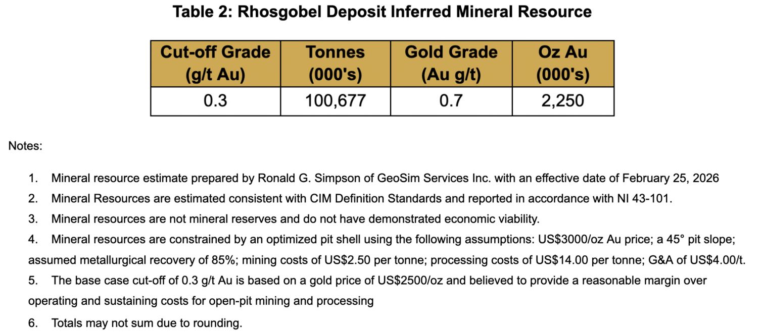 - Maiden Mineral Resource Estimate ("MRE") defined for the Rhosgobel Gold Deposit, located on the Company's