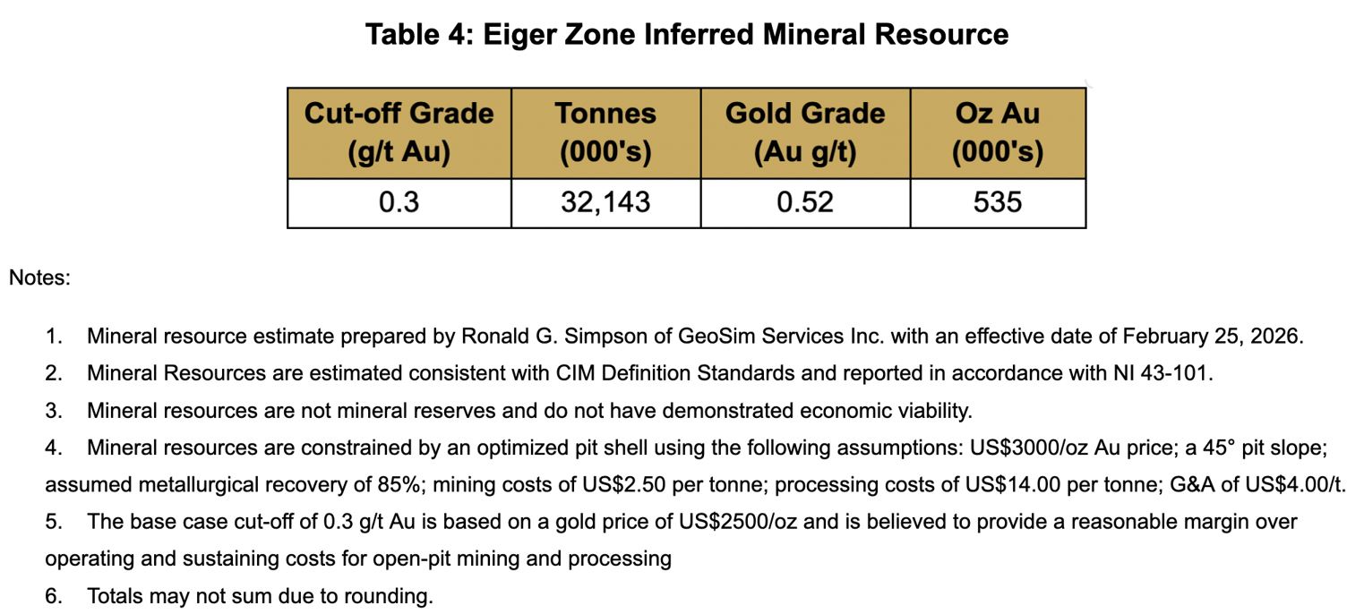 Updated MRE for the Eiger Gold Deposit has increased the resource to 535,000 ounces of gold (32.14 Mt @ 0.52 g/t Au) beginning at surface (see Table 4)