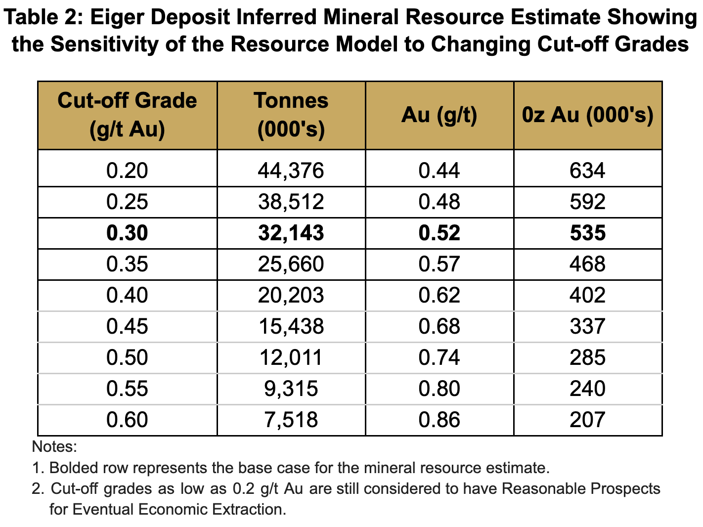 - 0.54 million ounces (32.14 Mt @ 0.52 g/t Au) at the Eiger Deposit.
