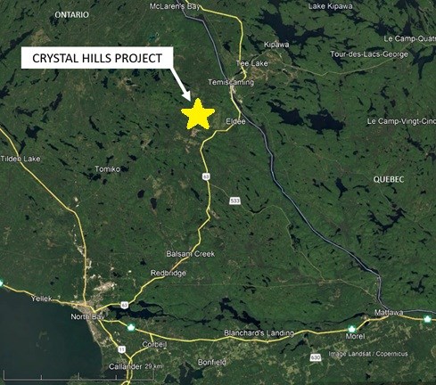 100% interest of the Crystal Hills Project, located in Clarkson Township, Ontario, Canada, approximately 40 km as the crow flies north of the city of North Bay. The project consists of five mineral claims comprised of eighteen (18) cells totalling approximately 400 hectares. (see Figure 1 below); - Geologically, the Crystal Hills Project consists of a high purity crystalline quartzite formation which is expressed at surface as a series of topographic high hills, these hills are tens of metres high by hundreds of metres wide with approximately three kilometres of strike length of this formation is present within the mineral claim boundary.