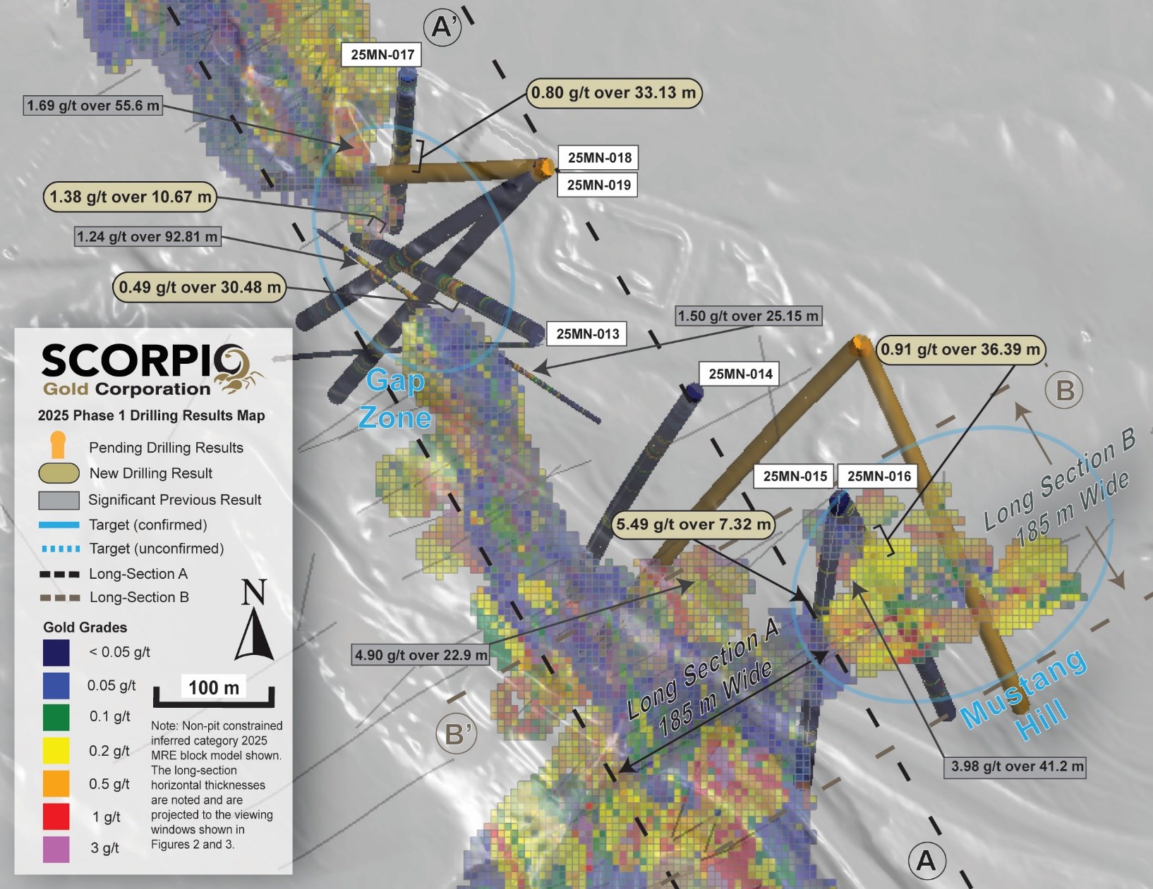 Scorpio Gold's VP Exploration, Harrison Pokrandt, commented, "As we continue to receive results from our Phase 1 drilling program, these first results at Mustang Hill and additional results within the Gap Zone add ounces to open areas that are along strike of our maiden resource. These results continue to support our objective of expanding the maiden resource at Manhattan to achieve our next goal of two-million-ounces of high-grade gold. With continued drilling, we expect to be able to evaluate potential updates to the resource estimate and ultimately achieve Manhattan's full potential."