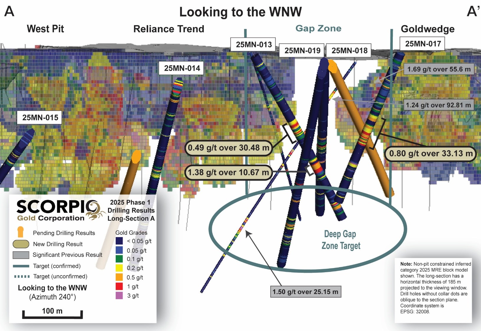 Phase 1 of the 2025 drilling program targeted (1) the Gap Zone, located between the historic Goldwedge and West Pit mines, along approximately 200 m of unexplored strike length, and (2) Mustang Hill's historic underground mines, see news release dated June 19, 2025. Holes 25MN-013, 25MN-017, and 25MN-019 targeted the Gap Zone, intersecting Reliance Trend gold mineralization connecting the West Pit and Goldwedge mines, and building upon results from holes 25MN-011 and 25MN-012, see news release dated August 25, 2025. Hole 25MN-014 targeted the Reliance Trend, between the West Pit and the Gap Zone, stepping out and intersecting gold mineralization near surface and at depth. Holes 25MN-015 and 25MN-016 targeted Mustang Hill, and both intersected gold mineralization near surface along the trend (see Figure 1).