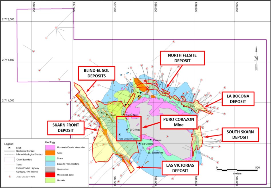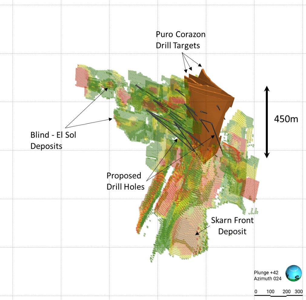 Figure 2: Projected Puro Corazon drill targets within the Skarn Front and Blind-El Sol block models with proposed the drill pattern for Q4 drilling on the Puro Corazon claim