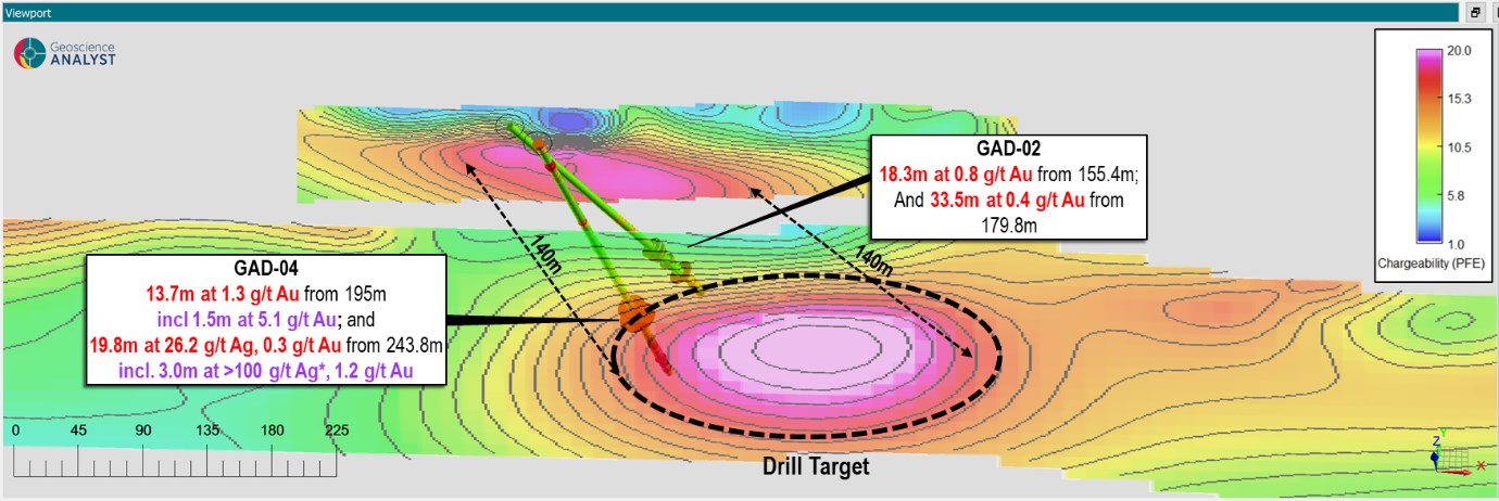 - The drilling focuses on targeting one very large and strong DDIP anomaly 200m wide located 140m along strike from significant intersections GAD-02 and GAD-04 (Figure 2).